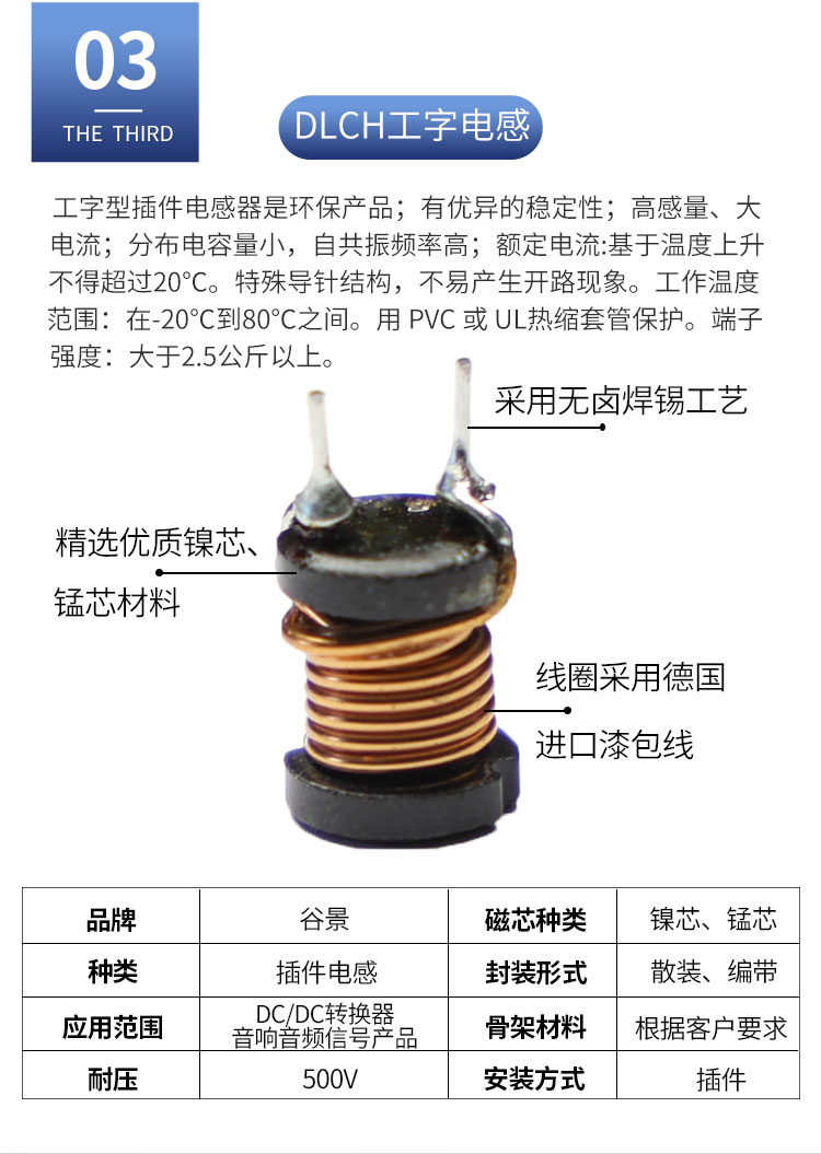 二、三腳工字電感DLGB3X應用領域:DC/DC轉換等;音響音頻信號產品;個人電腦等;電力設備